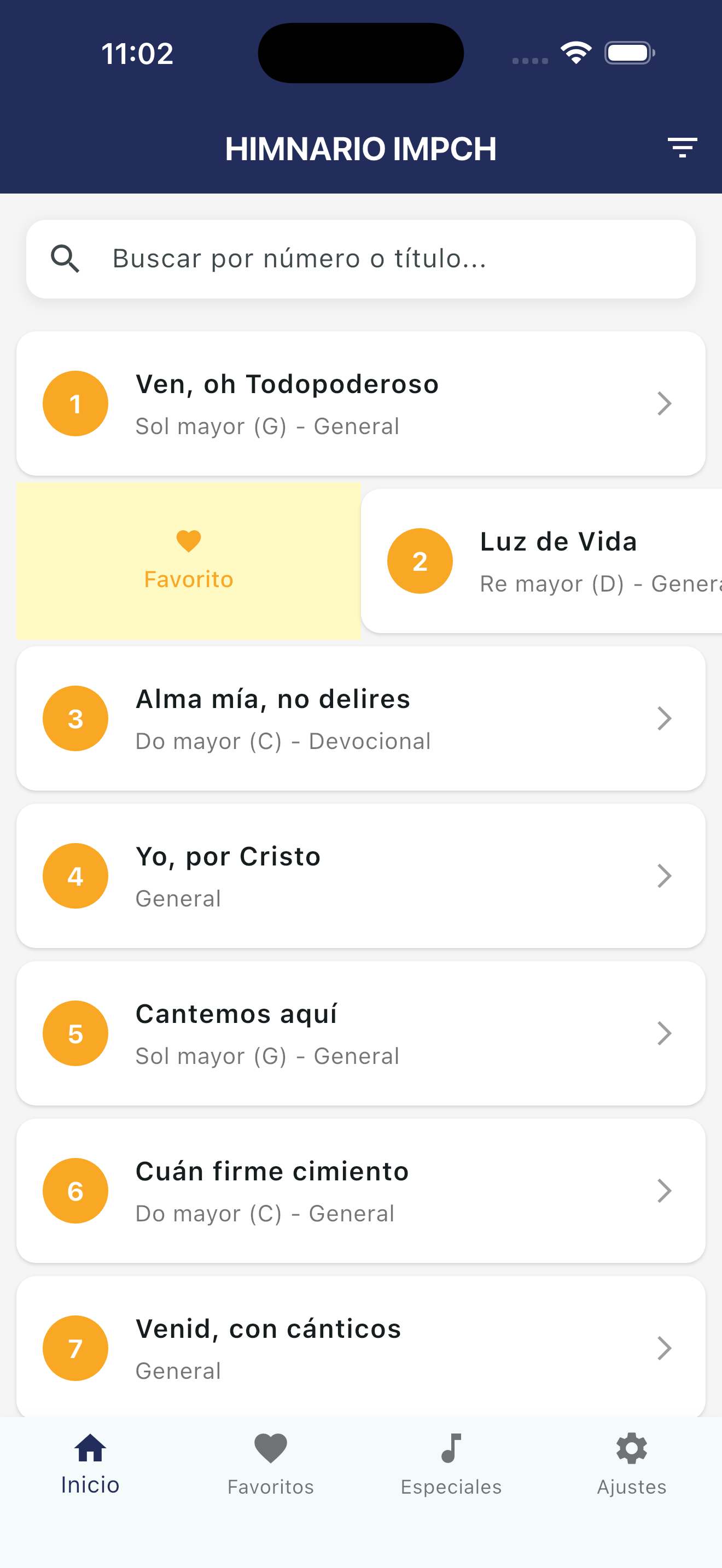 Desliza sobre un himno para guardarlo en favoritos y acceder rápidamente a él.